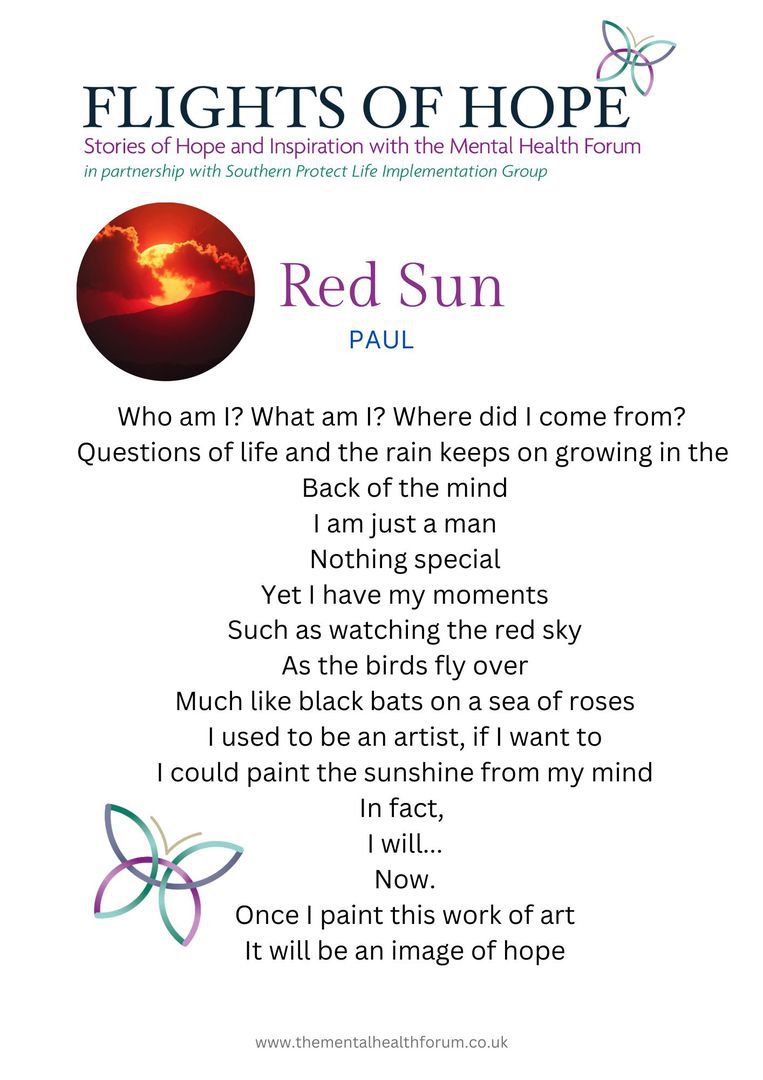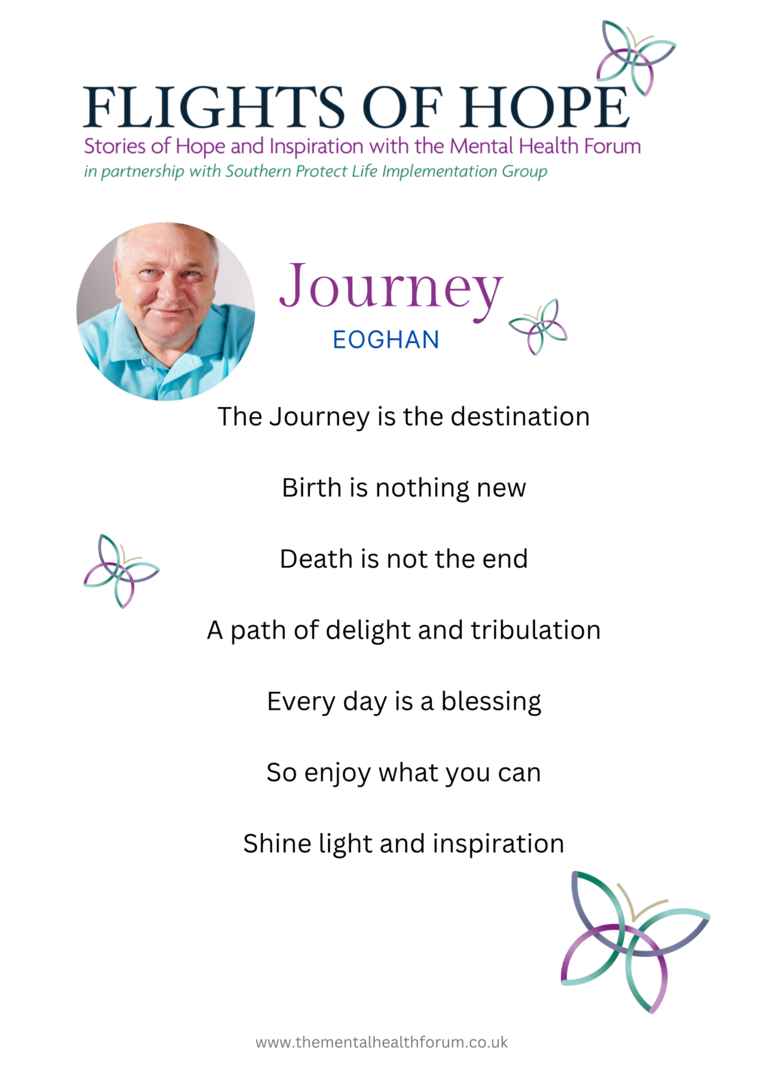 was written exclusively for the Mental Health Forum’s new book Flights of Hope. He has written extensively about depression and PTSD. Seán is a professional member of The Irish Writers Centre in Dublin. His next collection of poetry, Feeling Gravity’s Pull is due out in the Spring of 2023.
